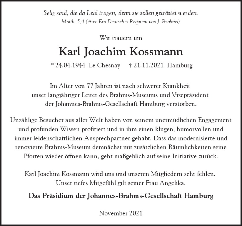 Hier finden Sie alle Traueranzeigen aus der Zeitung, die bisher für Karl Joachim Kossmann erschienen sind. Weitere Traueranzeigen, die in der Zeitung erscheinen, werden hier ebenfalls aufgelistet