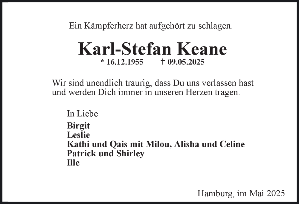 Hier finden Sie alle Traueranzeigen aus der Zeitung, die bisher für Karl-Stefan Keane erschienen sind. Weitere Traueranzeigen, die in der Zeitung erscheinen, werden hier ebenfalls aufgelistet