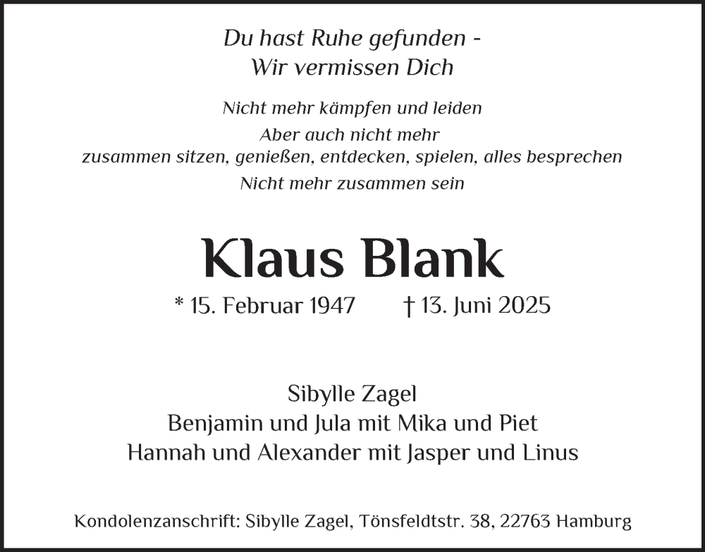 Hier finden Sie alle Traueranzeigen aus der Zeitung, die bisher für Klaus Blank erschienen sind. Weitere Traueranzeigen, die in der Zeitung erscheinen, werden hier ebenfalls aufgelistet