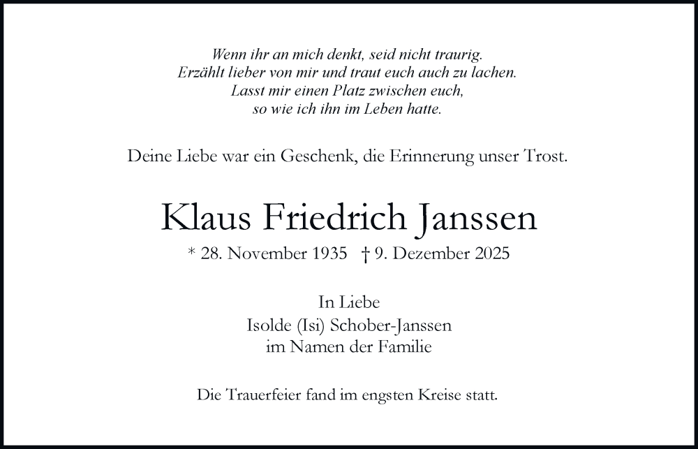 Hier finden Sie alle Traueranzeigen aus der Zeitung, die bisher für Klaus Friedrich Janssen erschienen sind. Weitere Traueranzeigen, die in der Zeitung erscheinen, werden hier ebenfalls aufgelistet