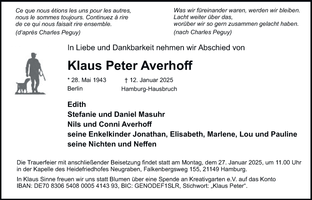 Hier finden Sie alle Traueranzeigen aus der Zeitung, die bisher für Klaus Peter Averhoff erschienen sind. Weitere Traueranzeigen, die in der Zeitung erscheinen, werden hier ebenfalls aufgelistet