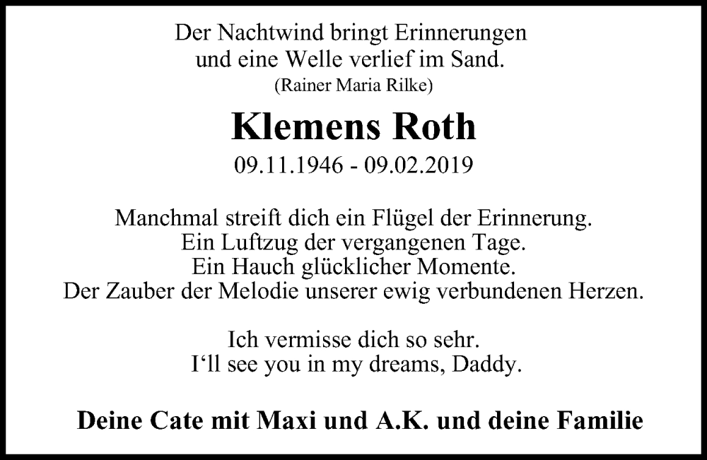 Hier finden Sie alle Traueranzeigen aus der Zeitung, die bisher für Klemens Roth erschienen sind. Weitere Traueranzeigen, die in der Zeitung erscheinen, werden hier ebenfalls aufgelistet