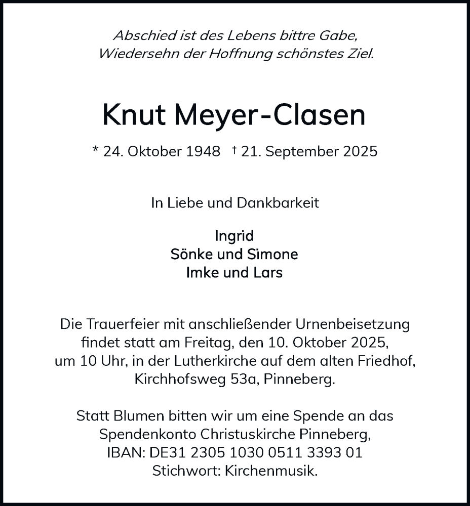 Hier finden Sie alle Traueranzeigen aus der Zeitung, die bisher für Knut Meyer-Clasen erschienen sind. Weitere Traueranzeigen, die in der Zeitung erscheinen, werden hier ebenfalls aufgelistet