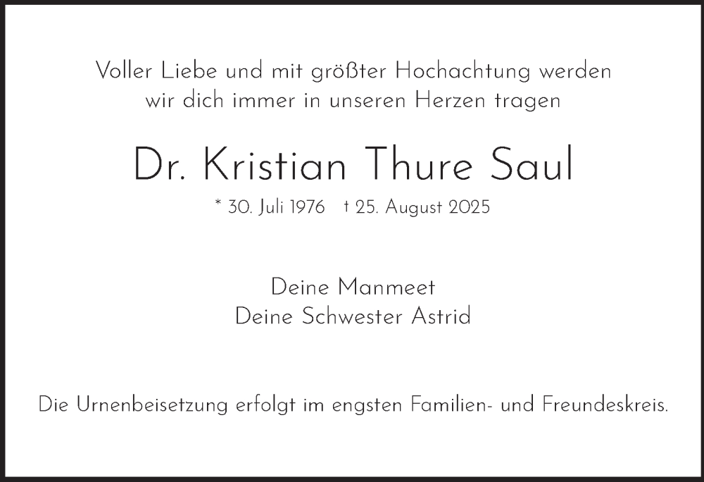 Hier finden Sie alle Traueranzeigen aus der Zeitung, die bisher für Kristian Thure Saul erschienen sind. Weitere Traueranzeigen, die in der Zeitung erscheinen, werden hier ebenfalls aufgelistet