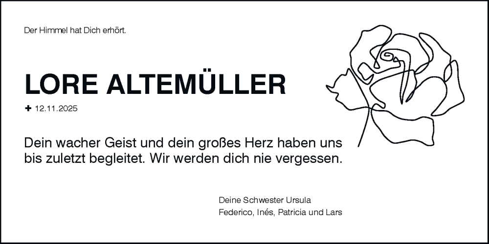 Hier finden Sie alle Traueranzeigen aus der Zeitung, die bisher für Lore Altemüller erschienen sind. Weitere Traueranzeigen, die in der Zeitung erscheinen, werden hier ebenfalls aufgelistet