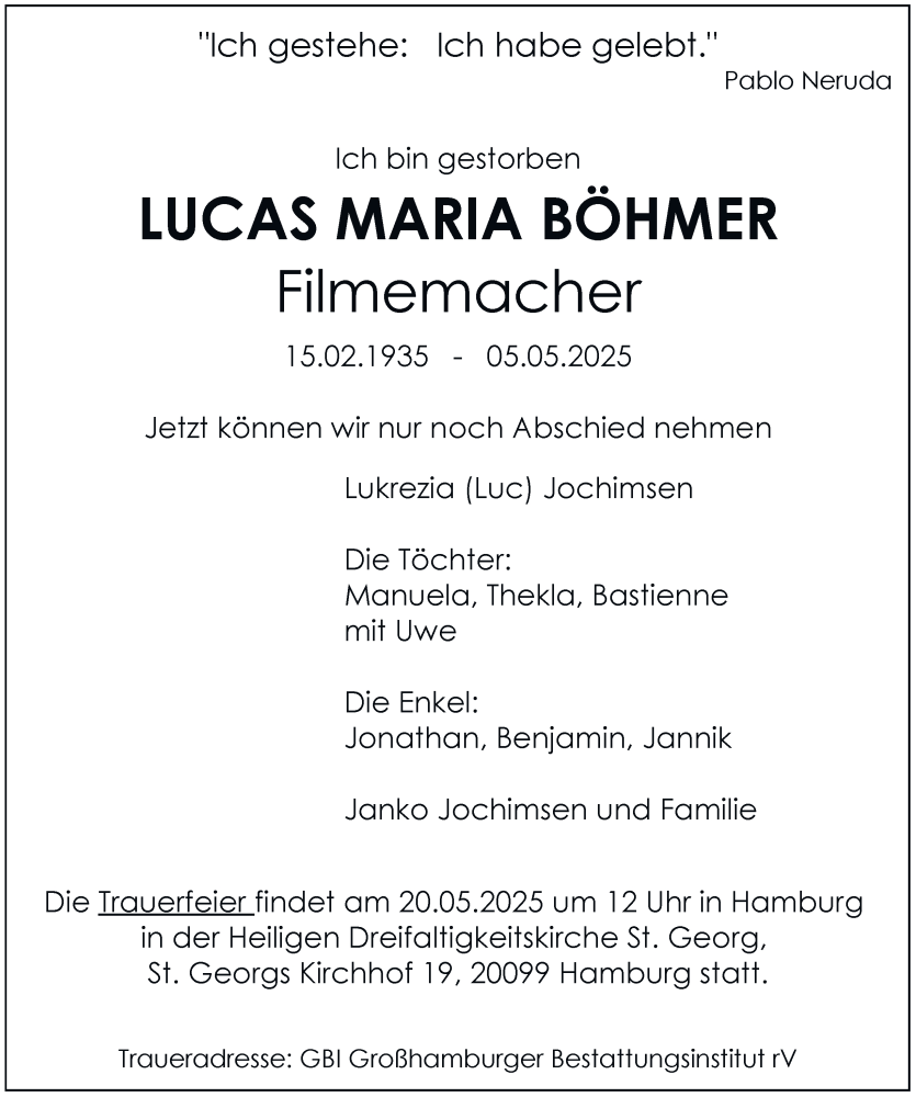 Hier finden Sie alle Traueranzeigen aus der Zeitung, die bisher für Lucas Böhmer erschienen sind. Weitere Traueranzeigen, die in der Zeitung erscheinen, werden hier ebenfalls aufgelistet