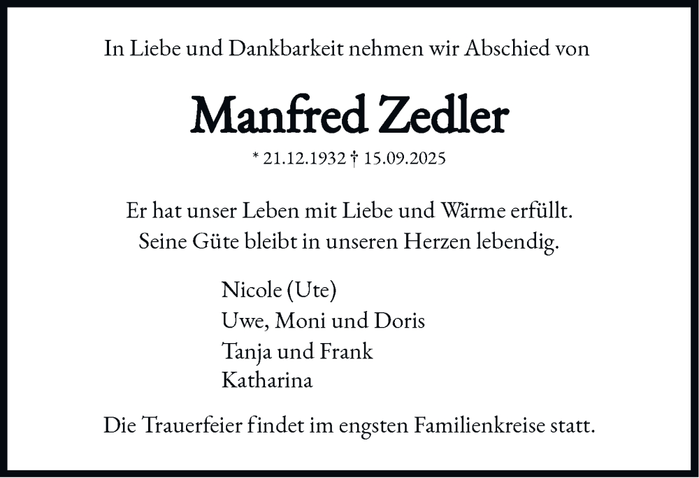 Hier finden Sie alle Traueranzeigen aus der Zeitung, die bisher für Manfred Zedler erschienen sind. Weitere Traueranzeigen, die in der Zeitung erscheinen, werden hier ebenfalls aufgelistet