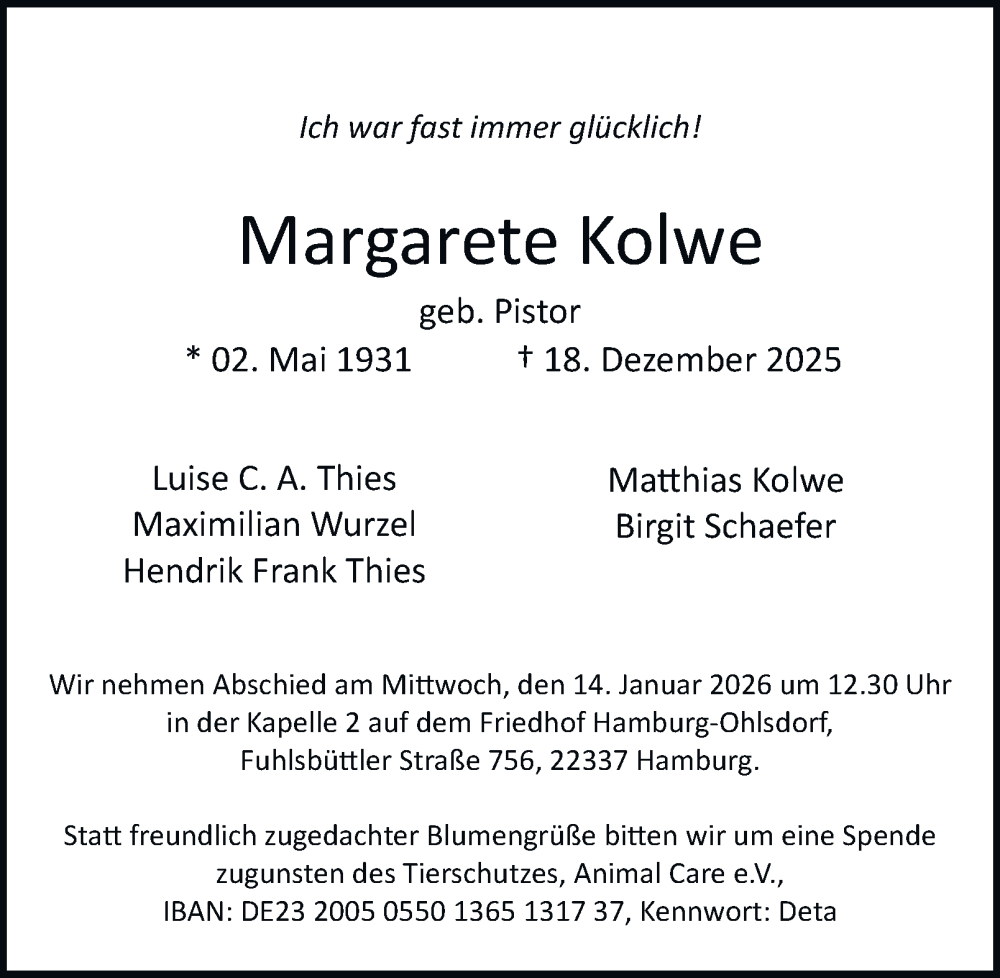 Hier finden Sie alle Traueranzeigen aus der Zeitung, die bisher für Margarete Kolwe erschienen sind. Weitere Traueranzeigen, die in der Zeitung erscheinen, werden hier ebenfalls aufgelistet
