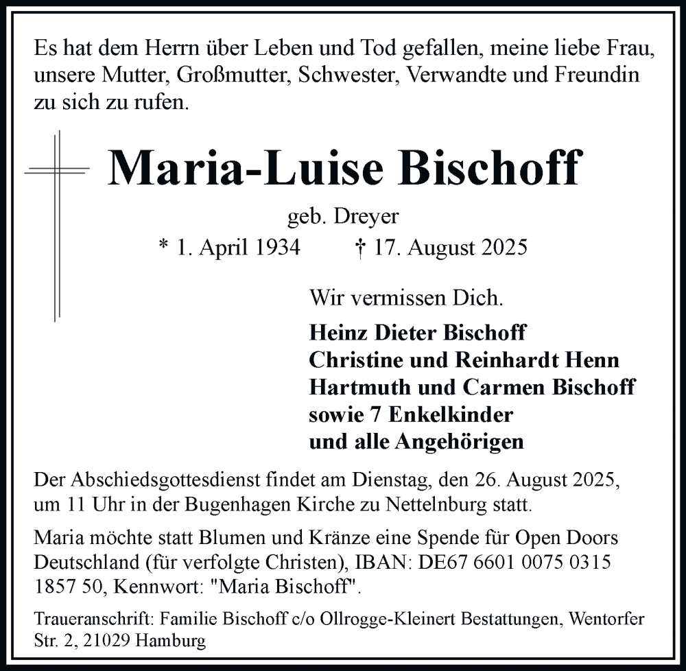 Hier finden Sie alle Traueranzeigen aus der Zeitung, die bisher für Maria-Luise Bischoff erschienen sind. Weitere Traueranzeigen, die in der Zeitung erscheinen, werden hier ebenfalls aufgelistet