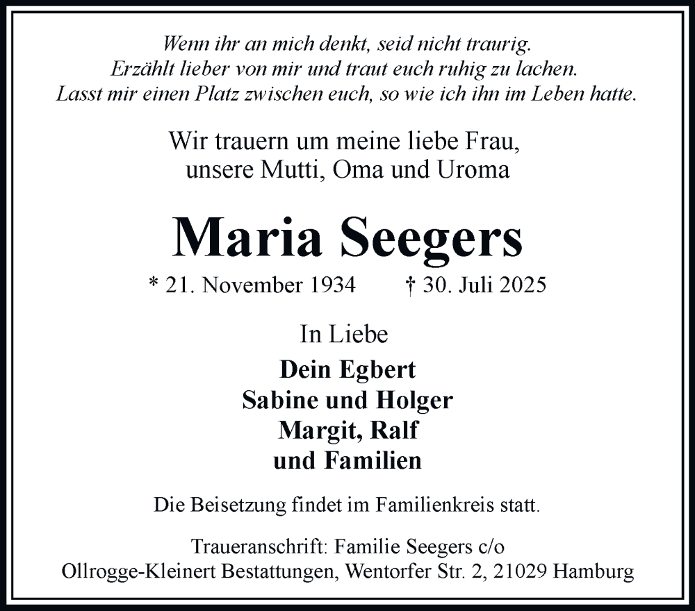 Hier finden Sie alle Traueranzeigen aus der Zeitung, die bisher für Maria Seegers erschienen sind. Weitere Traueranzeigen, die in der Zeitung erscheinen, werden hier ebenfalls aufgelistet