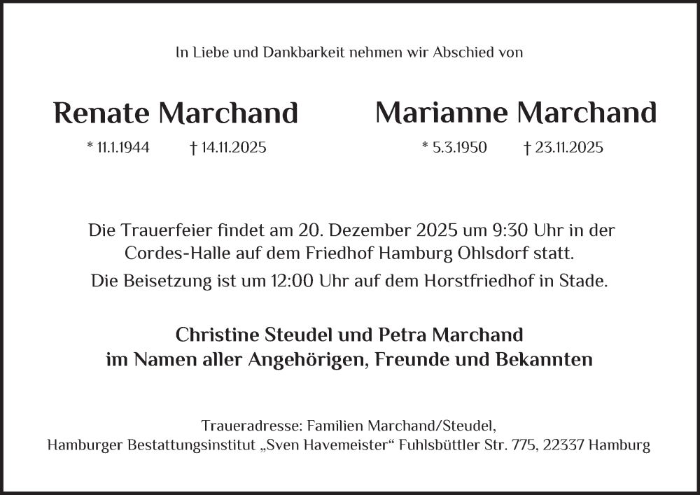 Hier finden Sie alle Traueranzeigen aus der Zeitung, die bisher für Marianne Marchand erschienen sind. Weitere Traueranzeigen, die in der Zeitung erscheinen, werden hier ebenfalls aufgelistet