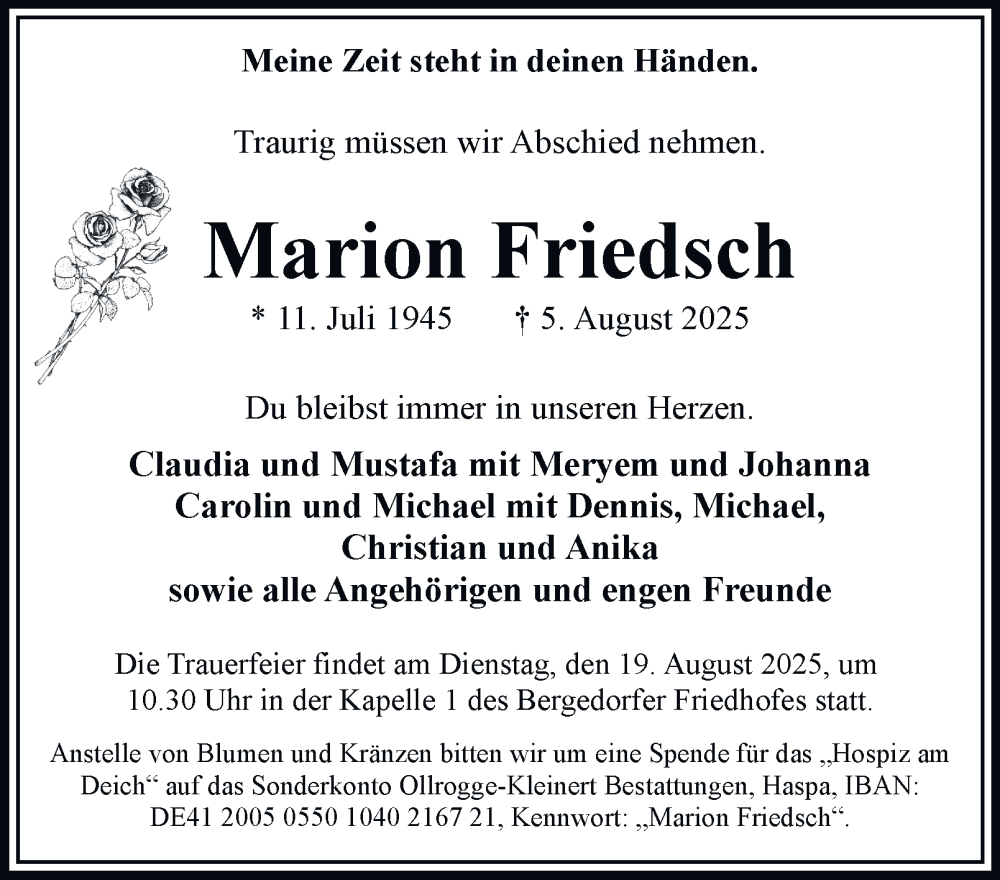 Hier finden Sie alle Traueranzeigen aus der Zeitung, die bisher für Marion Friedsch erschienen sind. Weitere Traueranzeigen, die in der Zeitung erscheinen, werden hier ebenfalls aufgelistet