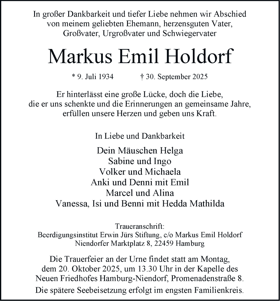 Hier finden Sie alle Traueranzeigen aus der Zeitung, die bisher für Markus Emil Holdorf erschienen sind. Weitere Traueranzeigen, die in der Zeitung erscheinen, werden hier ebenfalls aufgelistet