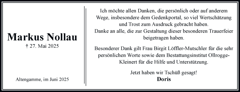 Hier finden Sie alle Traueranzeigen aus der Zeitung, die bisher für Markus Nollau erschienen sind. Weitere Traueranzeigen, die in der Zeitung erscheinen, werden hier ebenfalls aufgelistet