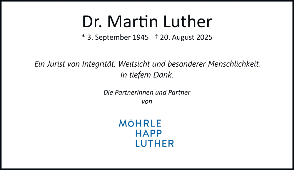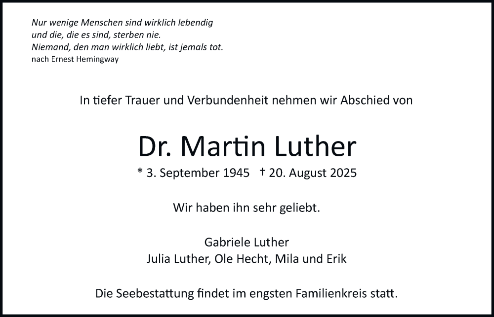 Hier finden Sie alle Traueranzeigen aus der Zeitung, die bisher für Martin Luther erschienen sind. Weitere Traueranzeigen, die in der Zeitung erscheinen, werden hier ebenfalls aufgelistet