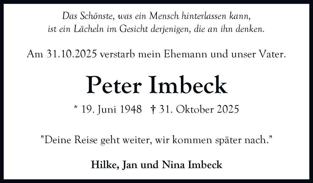 Hier finden Sie alle Traueranzeigen aus der Zeitung, die bisher für Peter Imbeck erschienen sind. Weitere Traueranzeigen, die in der Zeitung erscheinen, werden hier ebenfalls aufgelistet