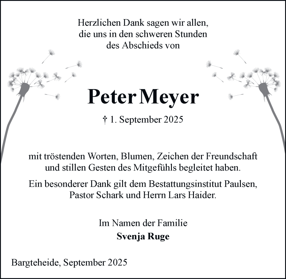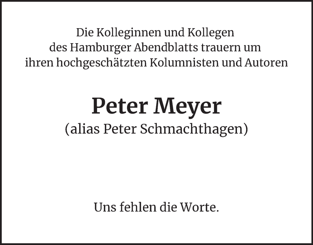 Hier finden Sie alle Traueranzeigen aus der Zeitung, die bisher für Peter Meyer erschienen sind. Weitere Traueranzeigen, die in der Zeitung erscheinen, werden hier ebenfalls aufgelistet