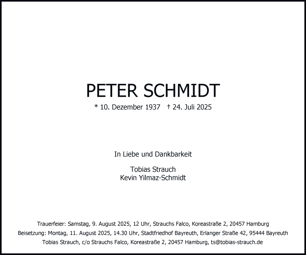 Hier finden Sie alle Traueranzeigen aus der Zeitung, die bisher für Peter Schmidt erschienen sind. Weitere Traueranzeigen, die in der Zeitung erscheinen, werden hier ebenfalls aufgelistet