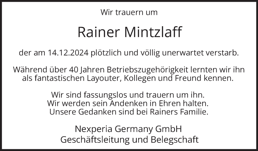 Hier finden Sie alle Traueranzeigen aus der Zeitung, die bisher für Rainer Mintzlaff erschienen sind. Weitere Traueranzeigen, die in der Zeitung erscheinen, werden hier ebenfalls aufgelistet
