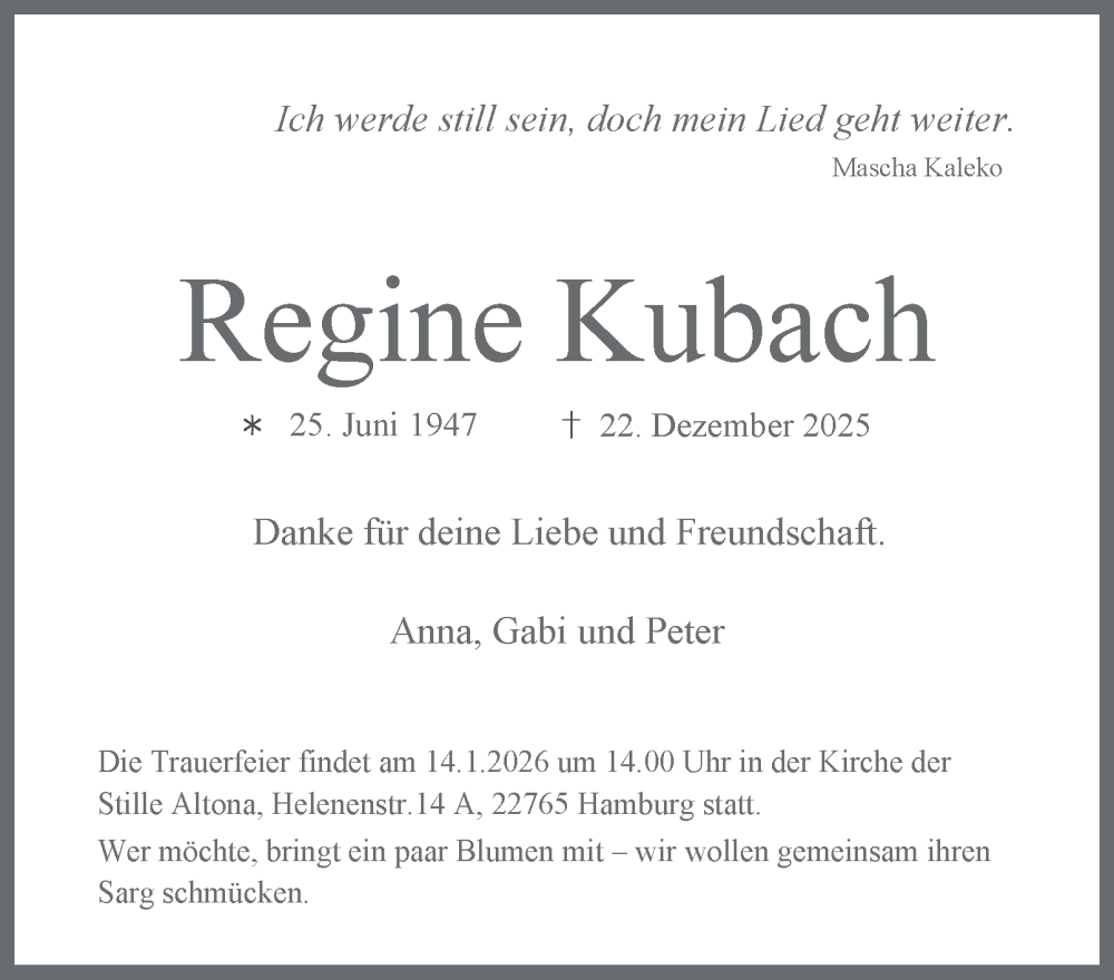 Hier finden Sie alle Traueranzeigen aus der Zeitung, die bisher für Regine Kubach erschienen sind. Weitere Traueranzeigen, die in der Zeitung erscheinen, werden hier ebenfalls aufgelistet