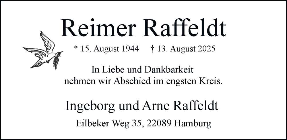 Hier finden Sie alle Traueranzeigen aus der Zeitung, die bisher für Reimer Raffeldt erschienen sind. Weitere Traueranzeigen, die in der Zeitung erscheinen, werden hier ebenfalls aufgelistet