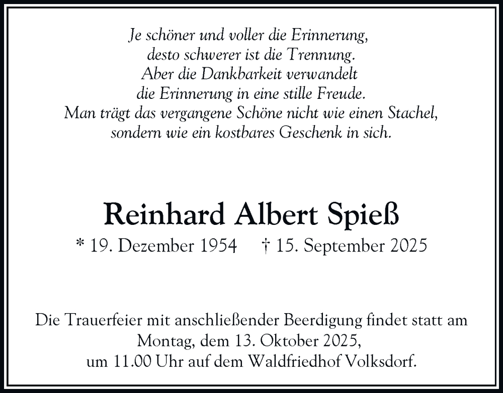 Hier finden Sie alle Traueranzeigen aus der Zeitung, die bisher für Reinhard Albert Spieß erschienen sind. Weitere Traueranzeigen, die in der Zeitung erscheinen, werden hier ebenfalls aufgelistet