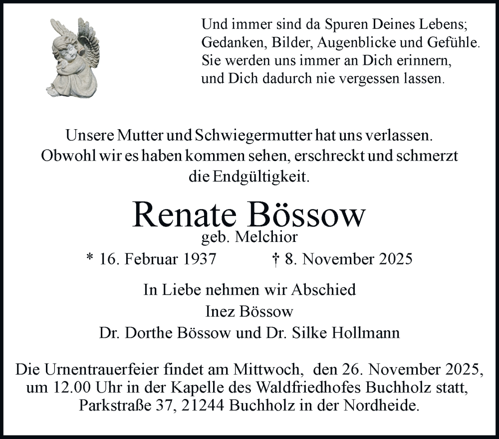 Hier finden Sie alle Traueranzeigen aus der Zeitung, die bisher für Renate Bössow erschienen sind. Weitere Traueranzeigen, die in der Zeitung erscheinen, werden hier ebenfalls aufgelistet