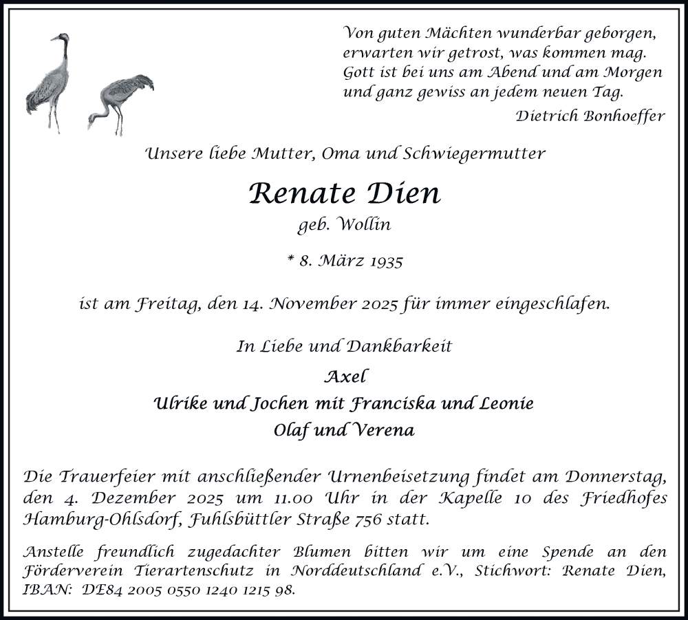 Hier finden Sie alle Traueranzeigen aus der Zeitung, die bisher für Renate Dien erschienen sind. Weitere Traueranzeigen, die in der Zeitung erscheinen, werden hier ebenfalls aufgelistet