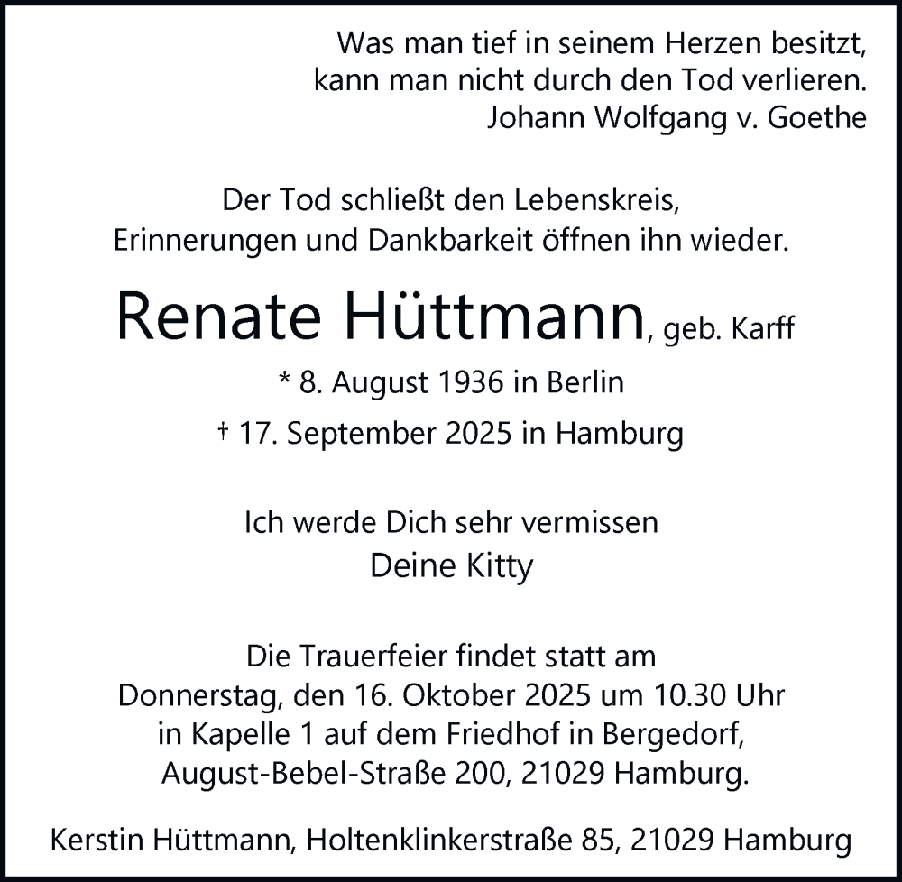 Hier finden Sie alle Traueranzeigen aus der Zeitung, die bisher für Renate Hüttmann erschienen sind. Weitere Traueranzeigen, die in der Zeitung erscheinen, werden hier ebenfalls aufgelistet