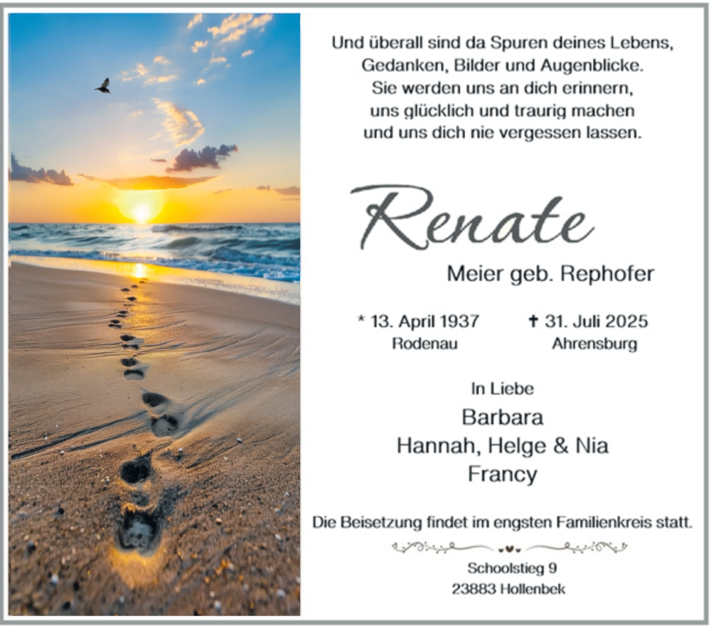 Hier finden Sie alle Traueranzeigen aus der Zeitung, die bisher für Renate Meyer erschienen sind. Weitere Traueranzeigen, die in der Zeitung erscheinen, werden hier ebenfalls aufgelistet