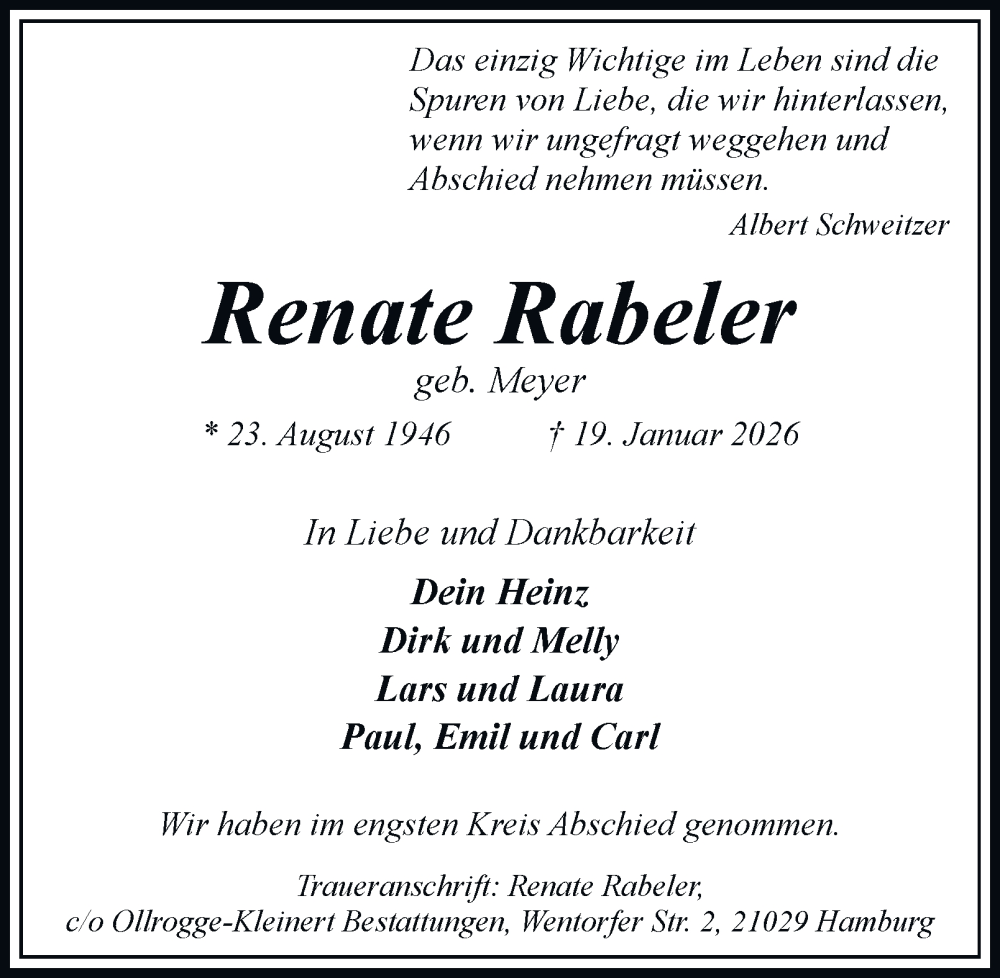 Hier finden Sie alle Traueranzeigen aus der Zeitung, die bisher für Renate Rabeler erschienen sind. Weitere Traueranzeigen, die in der Zeitung erscheinen, werden hier ebenfalls aufgelistet
