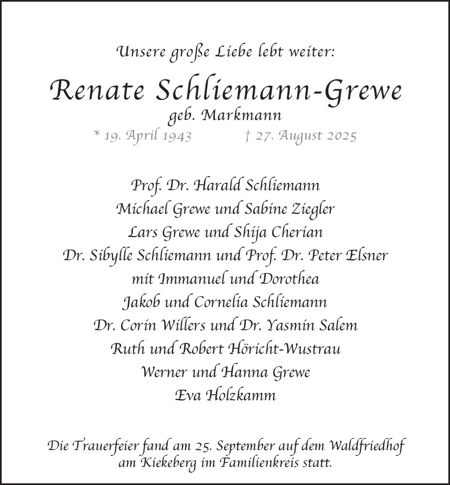 Hier finden Sie alle Traueranzeigen aus der Zeitung, die bisher für Renate Schliemann-Grewe erschienen sind. Weitere Traueranzeigen, die in der Zeitung erscheinen, werden hier ebenfalls aufgelistet