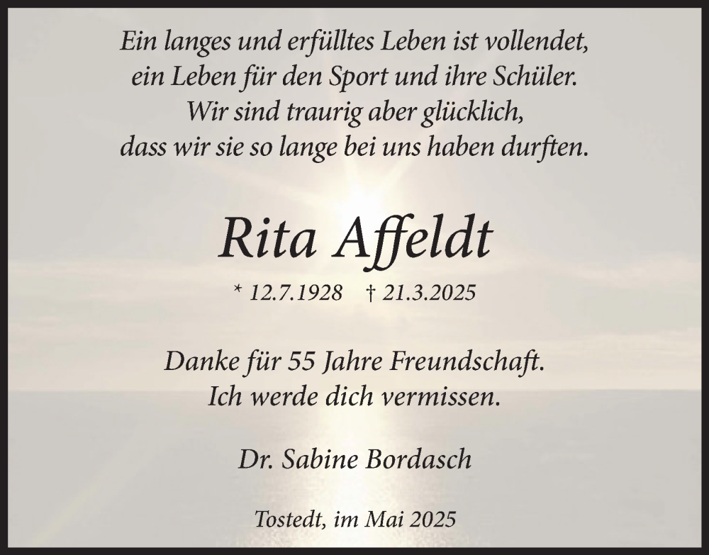 Hier finden Sie alle Traueranzeigen aus der Zeitung, die bisher für Rita Affeldt erschienen sind. Weitere Traueranzeigen, die in der Zeitung erscheinen, werden hier ebenfalls aufgelistet