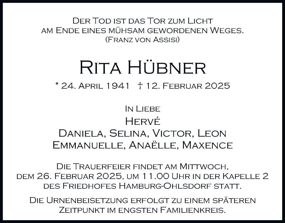 Hier finden Sie alle Traueranzeigen aus der Zeitung, die bisher für Rita Hübner erschienen sind. Weitere Traueranzeigen, die in der Zeitung erscheinen, werden hier ebenfalls aufgelistet
