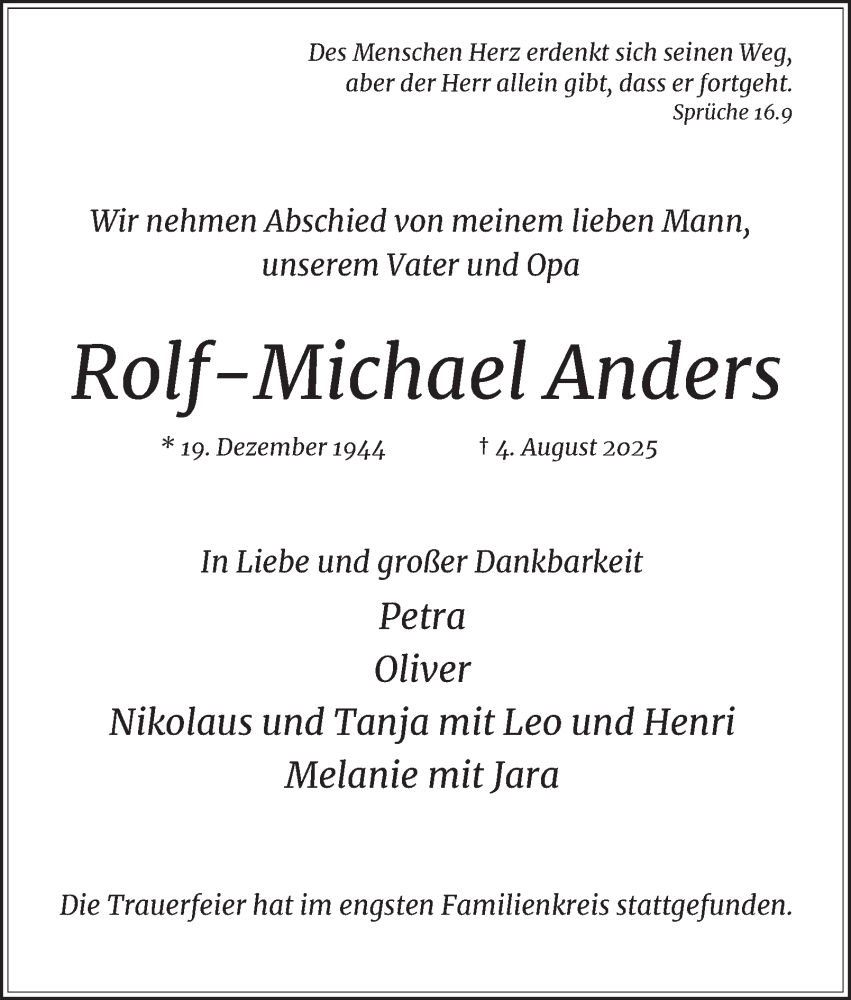 Hier finden Sie alle Traueranzeigen aus der Zeitung, die bisher für Rolf-Michael Anders erschienen sind. Weitere Traueranzeigen, die in der Zeitung erscheinen, werden hier ebenfalls aufgelistet