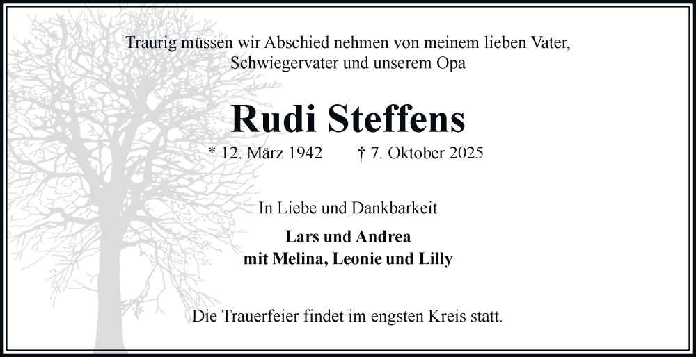Hier finden Sie alle Traueranzeigen aus der Zeitung, die bisher für Rudi Steffens erschienen sind. Weitere Traueranzeigen, die in der Zeitung erscheinen, werden hier ebenfalls aufgelistet