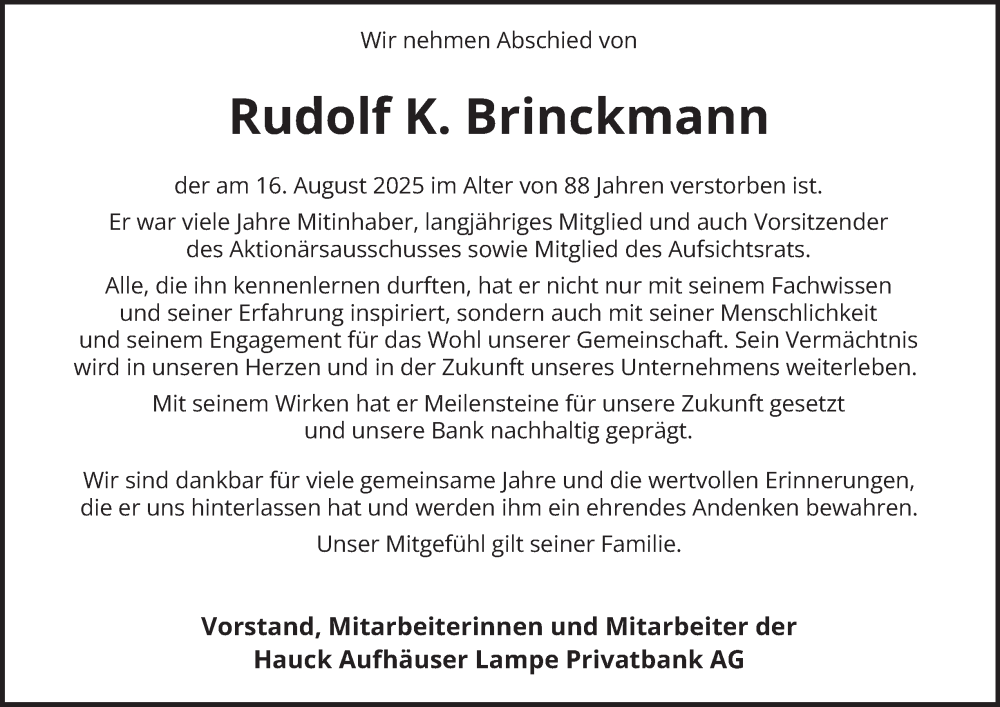 Hier finden Sie alle Traueranzeigen aus der Zeitung, die bisher für Rudolf K. Brinckmann erschienen sind. Weitere Traueranzeigen, die in der Zeitung erscheinen, werden hier ebenfalls aufgelistet