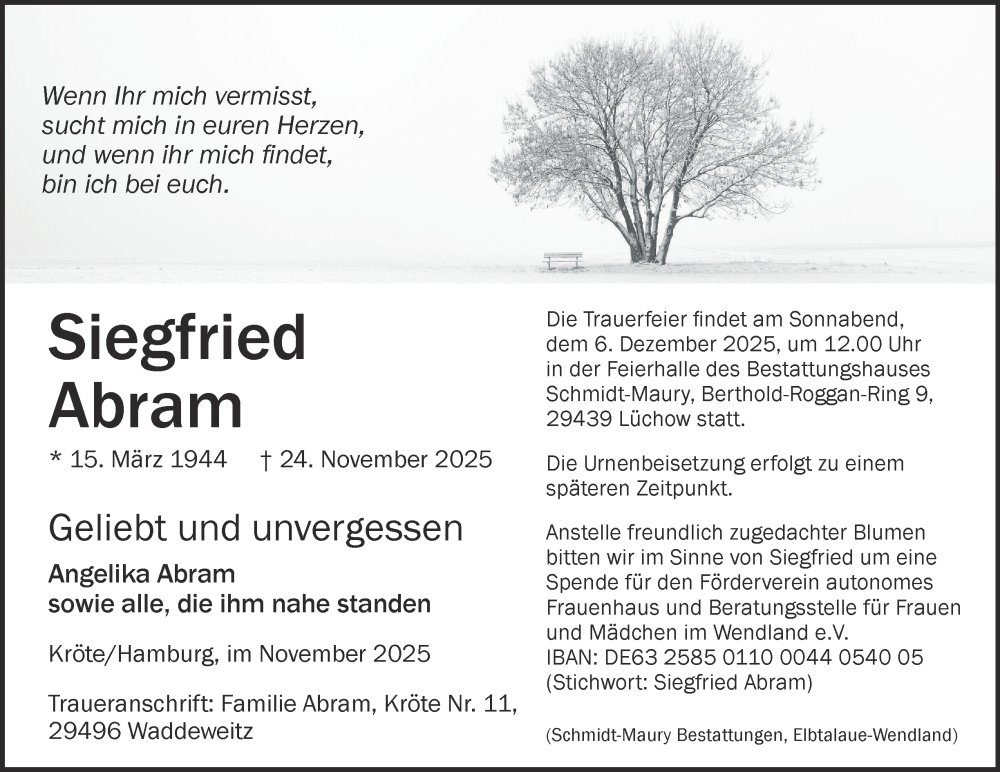 Hier finden Sie alle Traueranzeigen aus der Zeitung, die bisher für Siegfried Abram erschienen sind. Weitere Traueranzeigen, die in der Zeitung erscheinen, werden hier ebenfalls aufgelistet