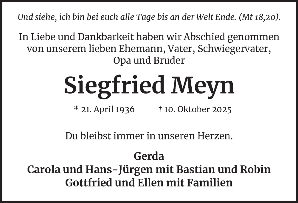 Hier finden Sie alle Traueranzeigen aus der Zeitung, die bisher für Siegfried Meyn erschienen sind. Weitere Traueranzeigen, die in der Zeitung erscheinen, werden hier ebenfalls aufgelistet