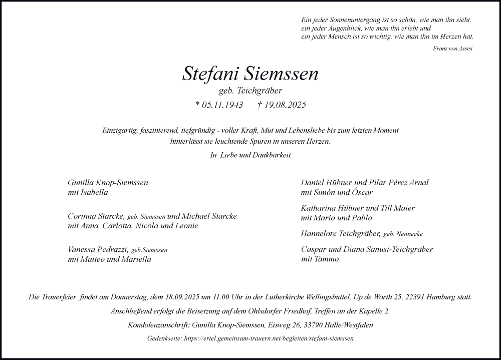 Hier finden Sie alle Traueranzeigen aus der Zeitung, die bisher für Stefani Siemssen erschienen sind. Weitere Traueranzeigen, die in der Zeitung erscheinen, werden hier ebenfalls aufgelistet