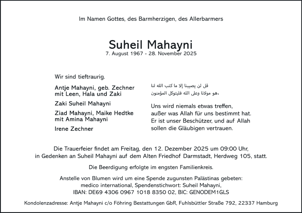 Hier finden Sie alle Traueranzeigen aus der Zeitung, die bisher für Suheil Mahayni erschienen sind. Weitere Traueranzeigen, die in der Zeitung erscheinen, werden hier ebenfalls aufgelistet