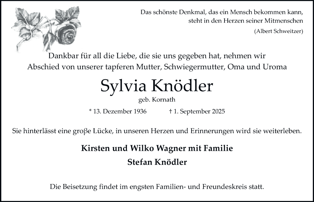 Hier finden Sie alle Traueranzeigen aus der Zeitung, die bisher für Sylvia Knödler erschienen sind. Weitere Traueranzeigen, die in der Zeitung erscheinen, werden hier ebenfalls aufgelistet