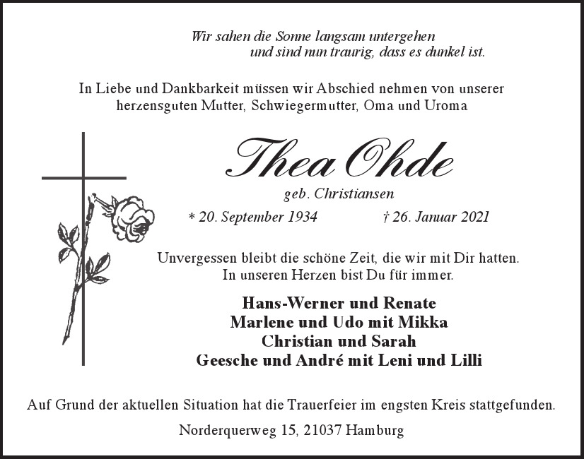 Hier finden Sie alle Traueranzeigen aus der Zeitung, die bisher für Thea Ohde erschienen sind. Weitere Traueranzeigen, die in der Zeitung erscheinen, werden hier ebenfalls aufgelistet