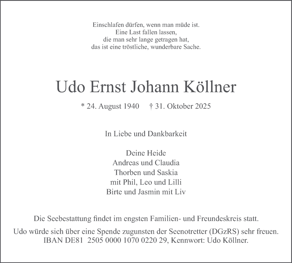 Hier finden Sie alle Traueranzeigen aus der Zeitung, die bisher für Udo Ernst Johann Köllner erschienen sind. Weitere Traueranzeigen, die in der Zeitung erscheinen, werden hier ebenfalls aufgelistet