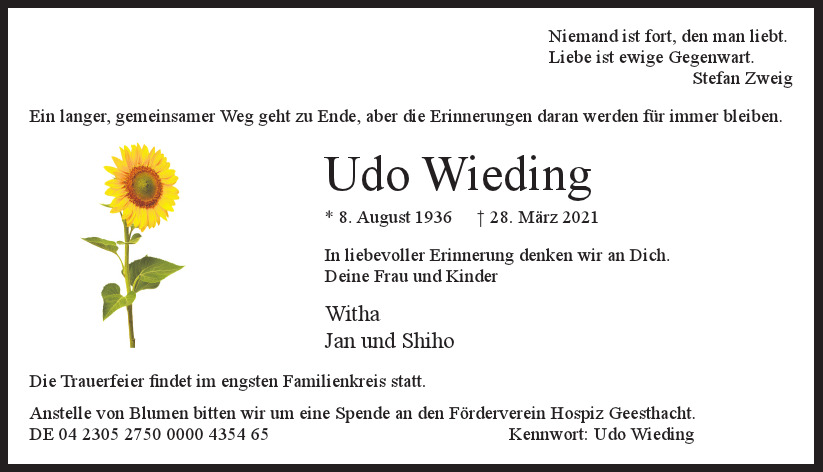 Hier finden Sie alle Traueranzeigen aus der Zeitung, die bisher für Udo Wieding erschienen sind. Weitere Traueranzeigen, die in der Zeitung erscheinen, werden hier ebenfalls aufgelistet