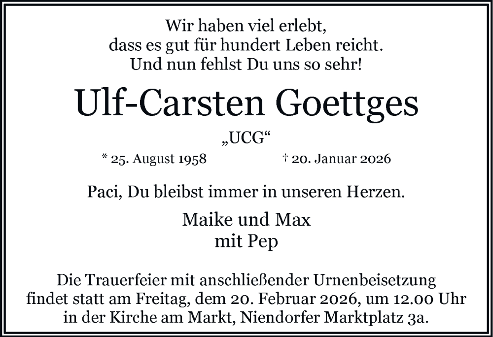 Hier finden Sie alle Traueranzeigen aus der Zeitung, die bisher für Ulf-Carsten Goettges erschienen sind. Weitere Traueranzeigen, die in der Zeitung erscheinen, werden hier ebenfalls aufgelistet