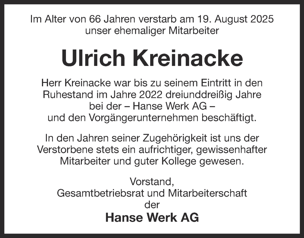 Hier finden Sie alle Traueranzeigen aus der Zeitung, die bisher für Ulrich Kreinacke erschienen sind. Weitere Traueranzeigen, die in der Zeitung erscheinen, werden hier ebenfalls aufgelistet