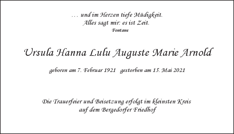 Hier finden Sie alle Traueranzeigen aus der Zeitung, die bisher für Ursula Hanna Lulu Auguste Marie Arnold erschienen sind. Weitere Traueranzeigen, die in der Zeitung erscheinen, werden hier ebenfalls aufgelistet