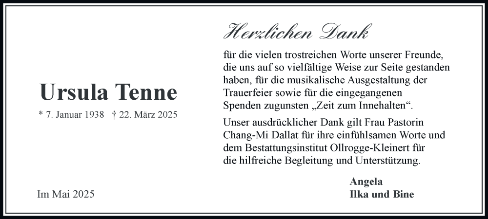 Hier finden Sie alle Traueranzeigen aus der Zeitung, die bisher für Ursula Tenne erschienen sind. Weitere Traueranzeigen, die in der Zeitung erscheinen, werden hier ebenfalls aufgelistet