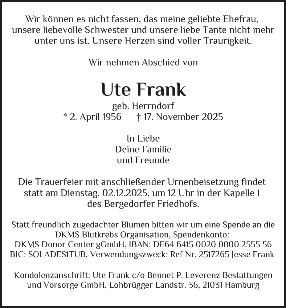 Hier finden Sie alle Traueranzeigen aus der Zeitung, die bisher für Ute Frank erschienen sind. Weitere Traueranzeigen, die in der Zeitung erscheinen, werden hier ebenfalls aufgelistet